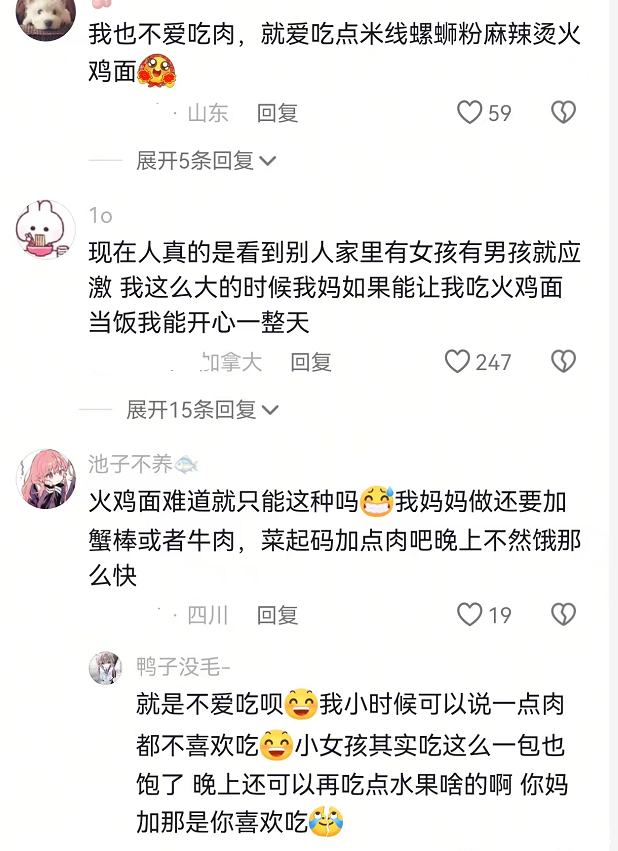 可点开更多的评论会发现,好像事情也不是这样。很多学生表示,如果自己小时候,被允许把火鸡面当成正餐吃的话,是非常乐意的。